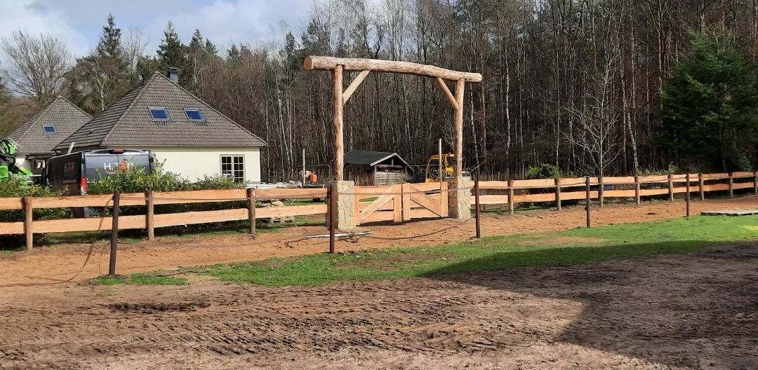 Van de Reep Omheiningen hat kürzlich einen wunderschönen Auftrag in Beekbergen abgeschlossen, bei dem wir einen schönen Eingang für einen neuen Hochzeitsort geschaffen haben. Es wird noch hart gearbeitet, um die Scheune und alle anderen Einrichtungen fertigzustellen. Der Zugang besteht aus Kastanienholz, während das Tor und das Geländer aus Lärchenschalung gefertigt sind. Dies verleiht ihm ein wunderschönes, ländliches Ambiente, das zusammen mit dem Durchgang und der Scheune ein herrliches Gesamtbild ergibt. Ausgezeichnete Arbeit von unserem Montageteam!